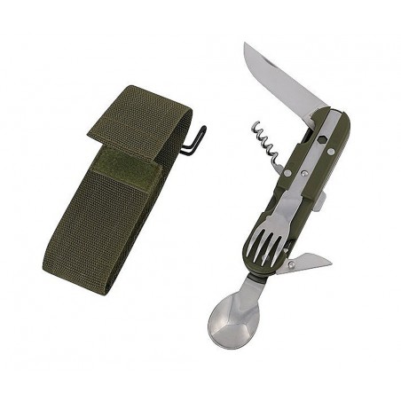 Uniwersalne narzędzie które pozwala na awaryjne przygotowanie bądź spożycie posiłku w terenie. Metalowe elementy zostały wykonane ze stali o podwyższonej odporności na korozję dzięki czemu nie wymagają uciążliwej konserwacji. Wygodna forma scyzoryka oraz dołączony pokrowiec pozwalają na komfortowe przenoszenie dzięki czemu niezbędnik idealnie wkomponuje się między innymi elementami ekwipunku.